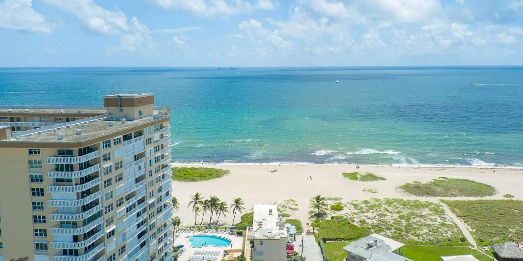 This beachfront property offers direct, private beach access and an outdoor pool. The resort is located on the coast of the Atlantic Ocean in Pompano Beach, Florida.