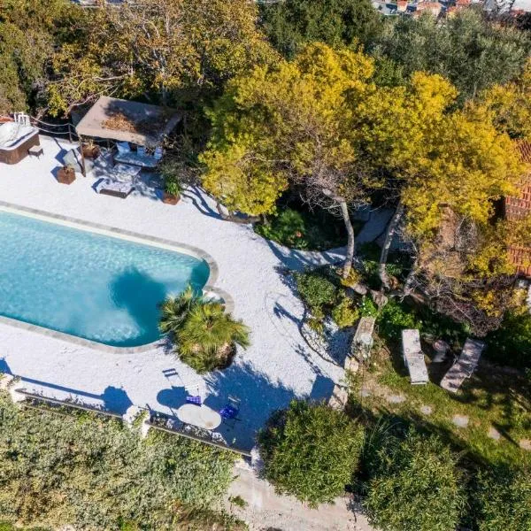 Villa Gaia - Luxury Villa, pool & wellness rooms in Bordighera biedt accommodatie met uitzicht op de tuin, een seizoensgebonden buitenzwembad, een tuin, een gedeelde lounge en een terras.