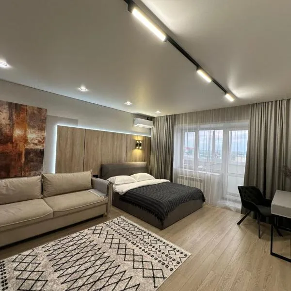 Situated in Kostanay, Однокомнатная студия, центр города features air-conditioned accommodation with a balcony and free WiFi. The property has river and city views.