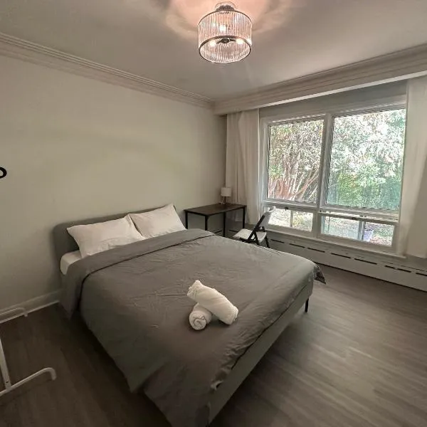 Serene Don River Nature gateway- 2BR suite, Private Patio, Free Parking — это апартаменты с балконом и видом на сад в городе Торонто региона Онтарио.