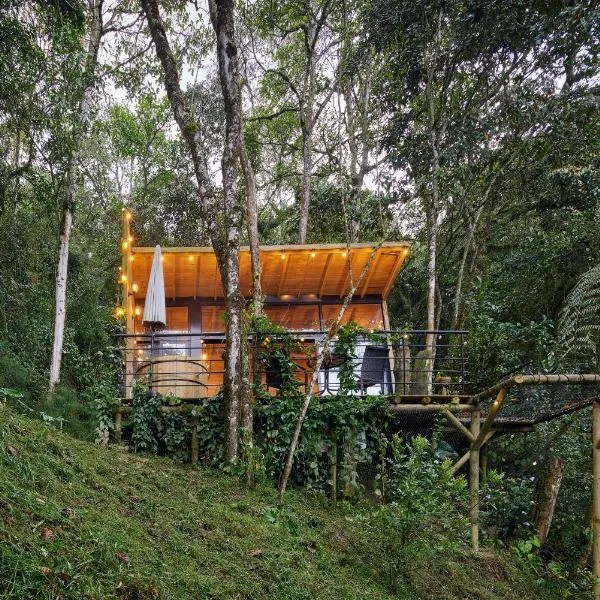 Glamping en Medellín - Kinsho Glamping - Cabaña con Jacuzzi privado — это шале в городе Медельин. Здесь есть сад, а также установлен бесплатный Wi-Fi. Из окон открывается вид на горы.