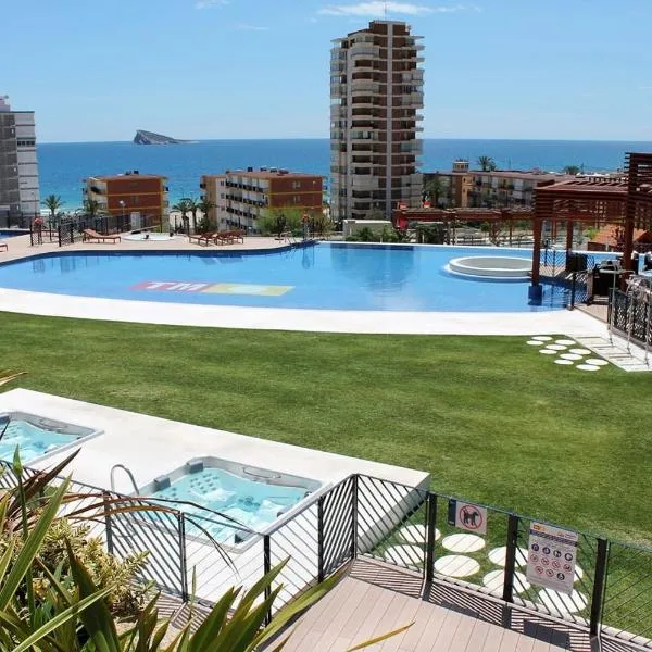 Sky intempo resort & spa Benidorm apartment bevindt zich in Benidorm, en biedt een terras met uitzicht op de stad en de zee, en een seizoensgebonden buitenzwembad, binnenbad en fitnessruimte.