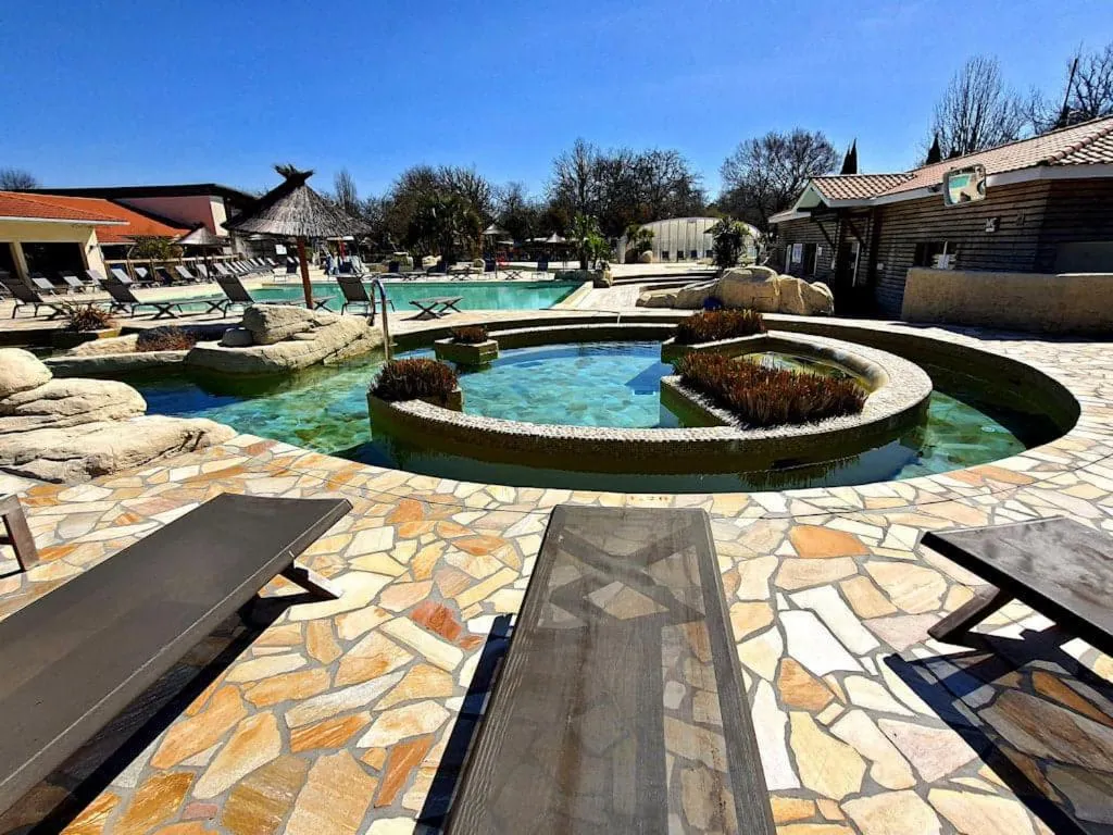 Boasting garden views, Chalet rénové, environnement très calme, piscines intérieure et extérieure chauffées, Bord du lac de Biscarosse Parentis features accommodation with a seasonal outdoor swimming...