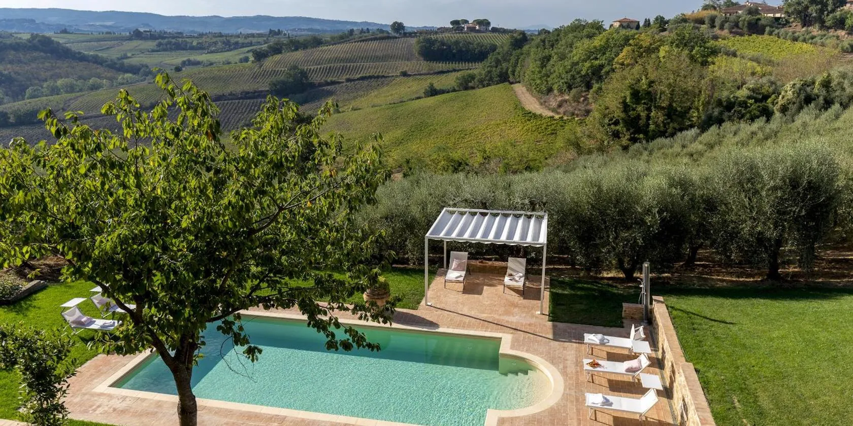 Set high in the Chianti Hills, Podere Il Pino is surrounded by olive groves and Tuscan vineyards. Offering panoramic views of nearby San Gimignano, it features an outdoor pool and small spa.