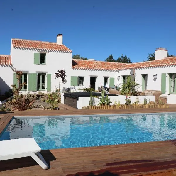 Set in L'Ile d'Yeu, a few steps from Plage de Saint-Aubin, Les Hautes Mers offers accommodation with a seasonal outdoor swimming pool, free private parking, a garden and a shared lounge.