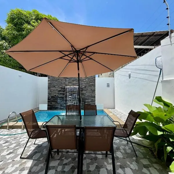 Villa acogedora en urb cerca del Malecon Salinas heeft een buitenzwembad, een tuin, een gedeelde lounge, en biedt accommodatie in Salinas met gratis WiFi en uitzicht op het zwembad.