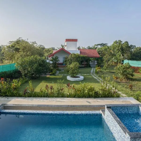 SaffronStays Casa Del Palms - 8BR luxury pool villa with gazebo, pickleball, bar & lawns near Nagaon Beach beschikt over een buitenzwembad, een tuin, een gedeelde lounge, en biedt accommodatie in...