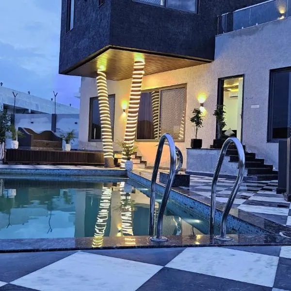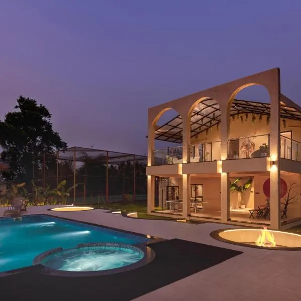 Το SaffronStays Episode - 5BR pet-friendly pool villa with themed rooms, cabana, bonfire & turf for sports near Karjat River βρίσκεται σε Jāmb και προσφέρει δωρεάν WiFi και θέα στο βουνό.