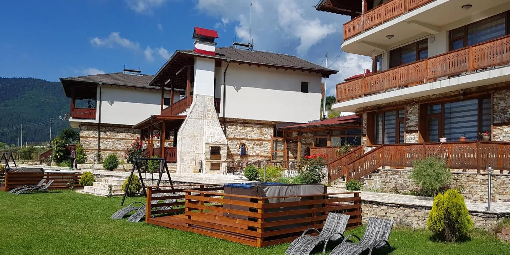 Το Панорама хаус Лещен и еко къщи Дървена и Землянка προσφέρει καταλύματα με εποχική εξωτερική πισίνα, δωρεάν WiFi, κήπο και κοινόχρηστο χώρο lounge στο Leshten.